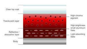 Saat cat disemprotkan ke mobil, ada teknik khusus agar volume cat bisa berkurang. Hasilnya warna menjadi lebih merata dengan penyebaran aluminium dan lapisan penyerap cahaya di seluruh bodi mobil.